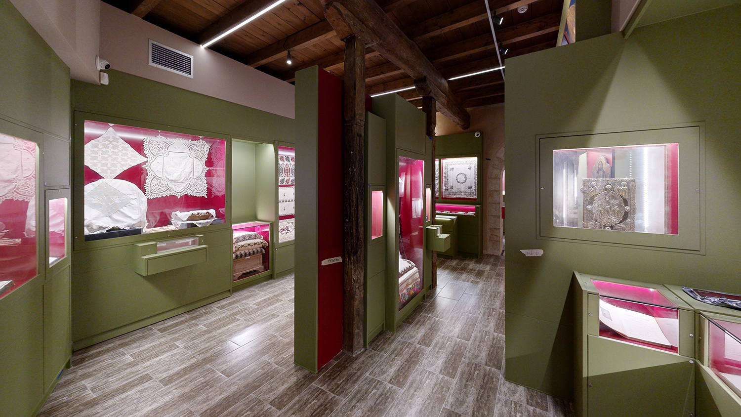 Η τελευταία υποενότητα έχει θέμα τα προικιά της Παναγίας. Η μονή κατέχει μεγάλη συλλογή από υφασμάτινα λαογραφικά αντικείμενα, ιδίως μεταξωτά, που καλύπτουν μια περίοδο από την αρχή του 20ου αιώνα έως τις μέρες μας. Αξιοσημείωτος είναι ο ετήσιος ρυθμός εμπλουτισμού της συλλογής που σχετίζεται άμεσα με τη λιτανεία της εικόνας της Παναγίας της Σκιαδενής στα χωριά της νότιας Ρόδου και της Χάλκης. Οι νοικοκυρές προσφέρουν πολλά από τα εργόχειρά τους, κεντημένα υφάσματα, μαντήλια, σκέπες και τραπεζομάντηλα. Έτσι «προικίζουν» την Παναγία, με αντικείμενα που εξυπηρετούν λειτουργικές ή χρηστικές ανάγκες της μονής. Προσφέροντας έργα για τα οποία αφιέρωσαν χρόνο και κόπο, εκφράζουν παράλληλα και παράκληση προς την Παναγία για προστασία.